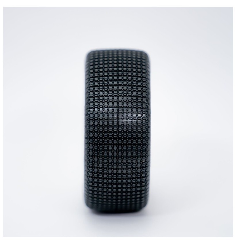 The tightly packed small pins with deep sipes create incredible traction (blue groove). It is also very efficient on hard-packed and oiled tracks.
