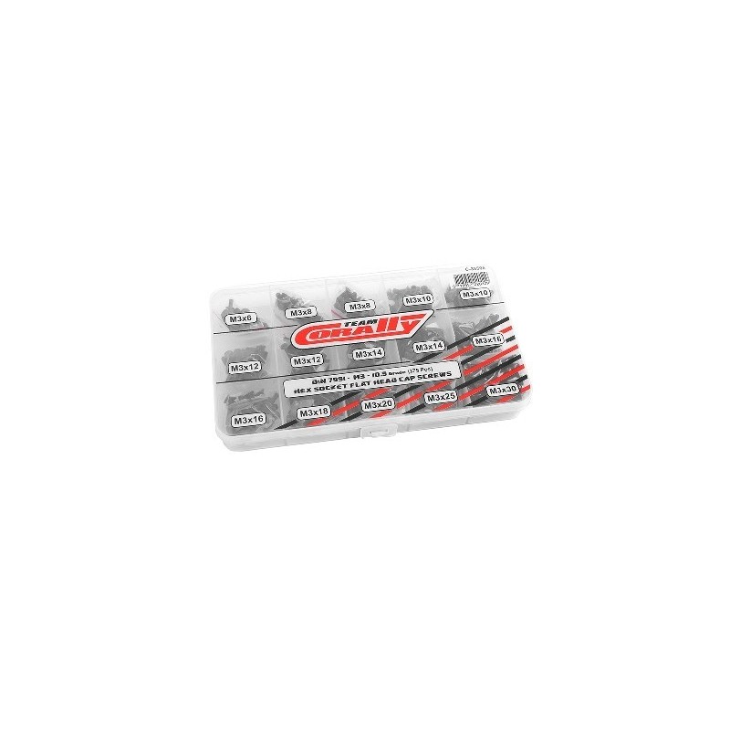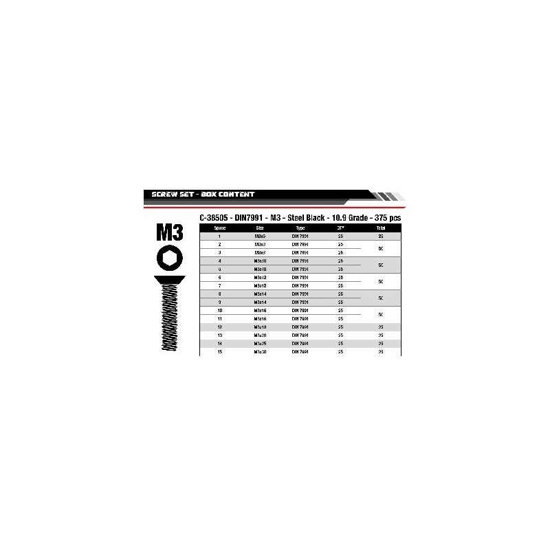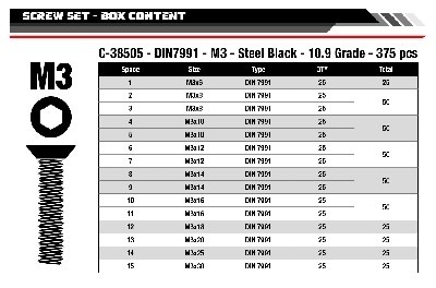 Screw Set M3 - Hex Flat Head - DIN 7991 - Steel Black - 10.9 Grade - 15 Sizes - 375 pcs